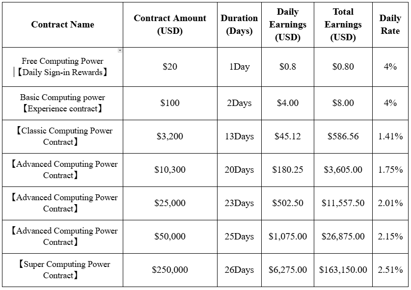 For instance, a novice is able to get his hands on the Experience Contract of $100 only, and go on to make stable returns, whereas a investor with a large amount of money may select the Super Computing Power Contract to be able to hit six-figure profits in less than 4 weeks.